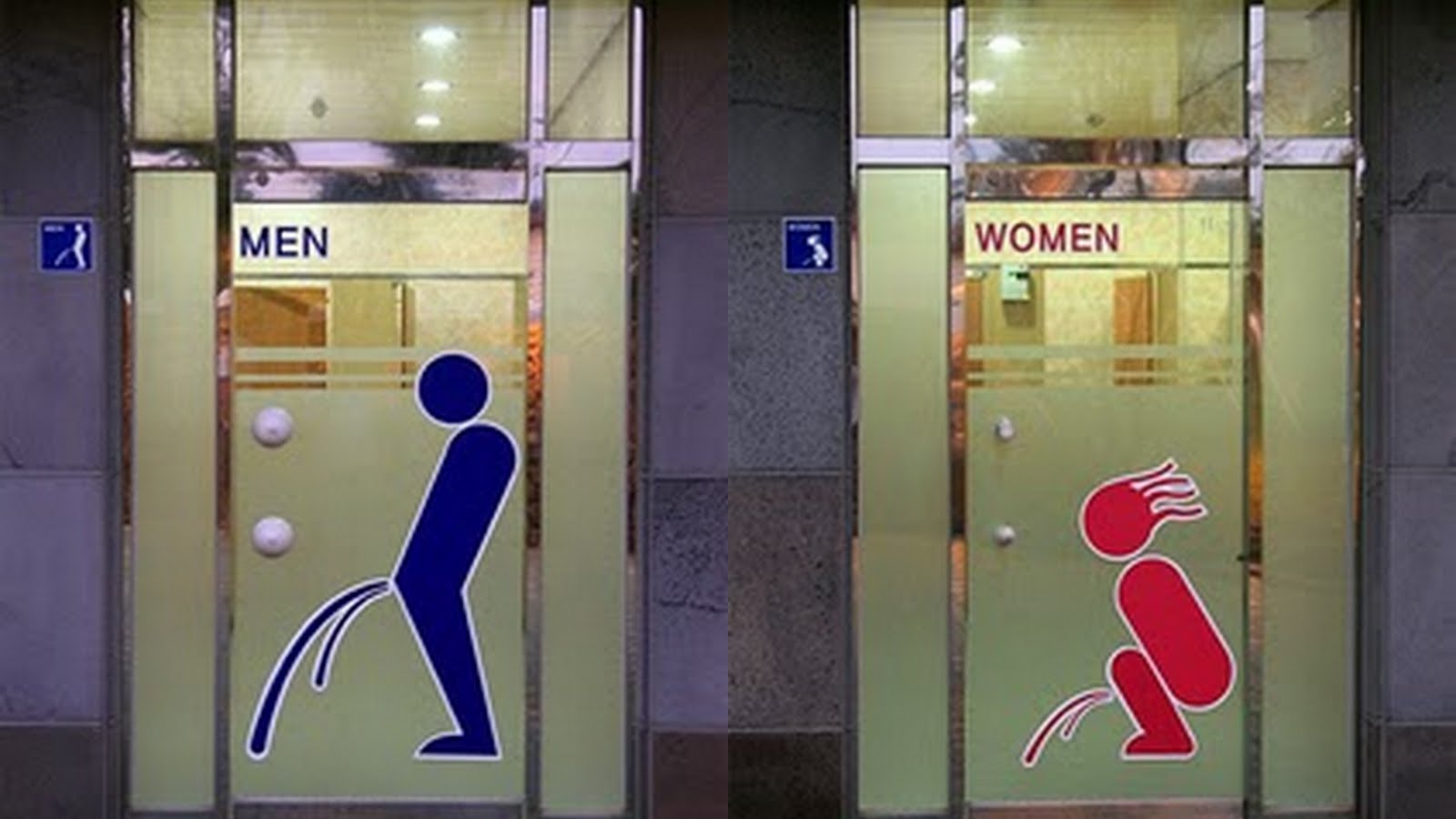 Somewhat related to the last category are the signs that pose the question: do you stand or sit when you pee?