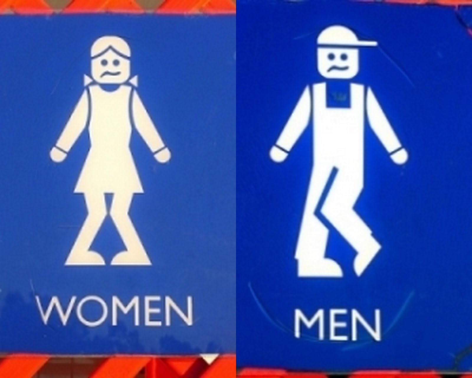 The most common type of washroom sign, pictured at the top of this post, is another example. Typically, these signs depict men as people, and women as people in skirts: